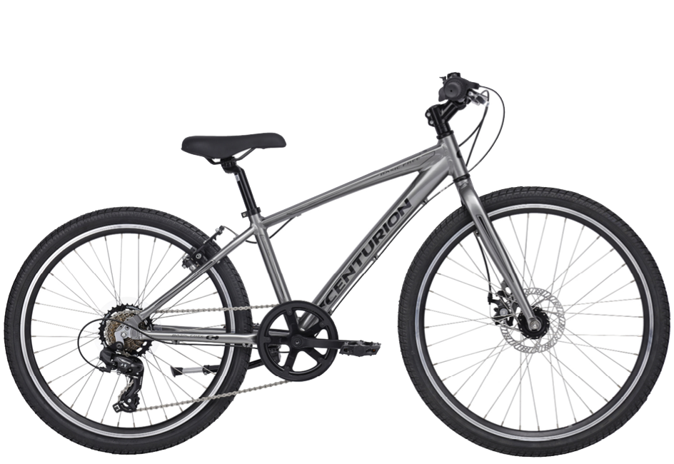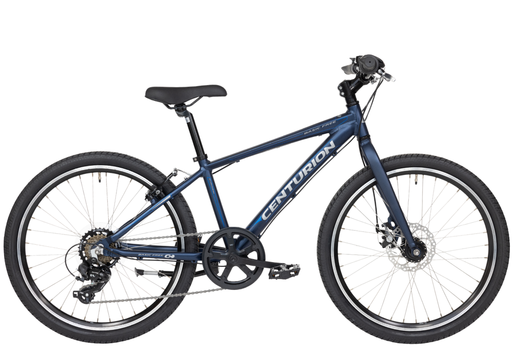 Centurion Basic Free Boy cykel monteret med affjedret forgaffel og 7 udvendige Shimano Tourney gear samt kaliberbremse og en ekstra mekanisk skivebremse.