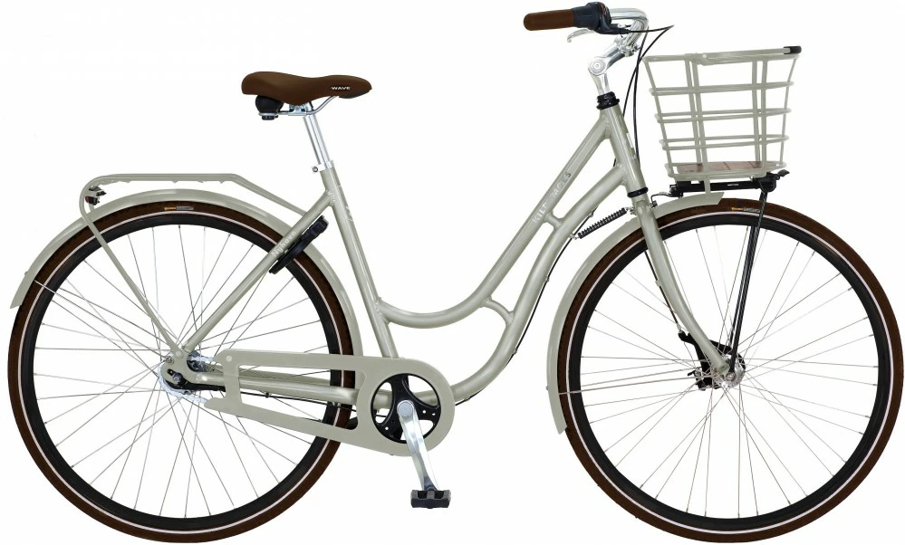 Kildemoes City Nyhavn shopping damecykel med indfarvet aftagelig aluminiums click frontkurv. Der sidder 7 indvendige Shimano Nexus gear samt fodbremse og en rullebremse på forhjulet.