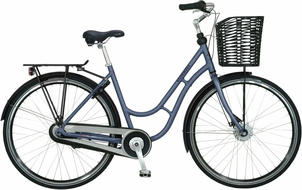 Kildemoes City Nysted shopping damecykel med dynamo forlygte og fastmonteret frontkurv i kunstrattan samt styrlås. Der sidder 7 indvendige Shimano Nexus gear samt fodbremse og en rullebremse på forhjulet.