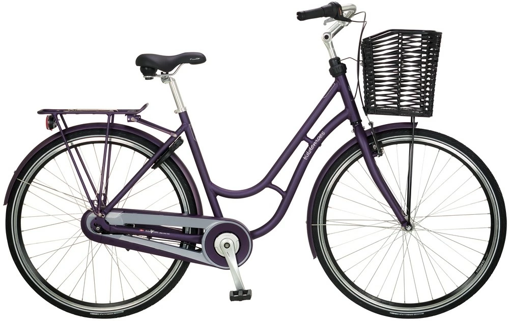 Cyklen er monteret med lukket kædekasse, ekstra kaliberbremse foran samt støtteben og godkendt lås.